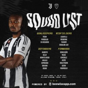 Resta out come da previsioni Koopmeiners oltre ai lungodegenti, a Gatti e a Vlahovic, mentre ci sarà Mbangula e torna fra i convocati Adzic mentre Pietrelli sarà a disposizione di Brambilla per la partita a Messina della Next Gen.